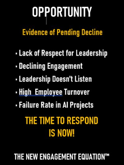 · Investment in Artificial Intelligence in the U.S. will reach $500 billion shortly. Unfortunately, Gartner reports that 80% of AI investment projects failed to achieve the return-on-investment targets that justified the investment. The primary reason for project failures can be tied to a Leadership-Employee Gap and an Engagement-AI Gap.